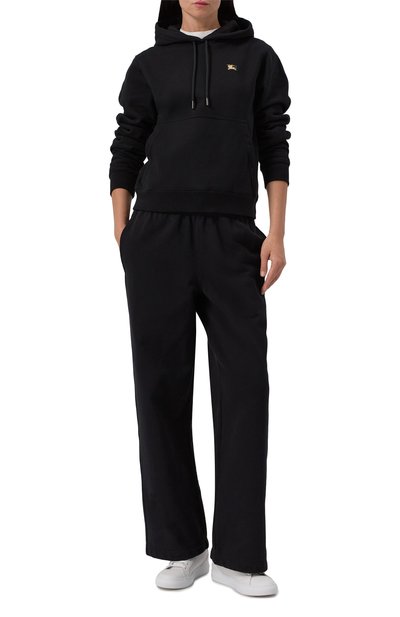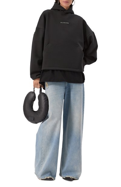 Миучча Прада и Раф Симонс включили в осенне-зимнюю коллекцию укороченное худи базового черного цвета. Для создания модели силуэта oversize использовали плотный шерстяной трикотаж с добавлением нежнейшего кашемира, поэтому вещь получилась не только теплой, но и особенно приятной на ощупь. На принадлежность изделия марки деликатно намекают объемная аппликация, сопровожденная фирменной биркой в тон.