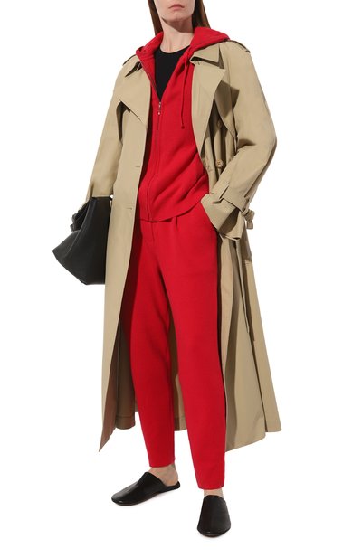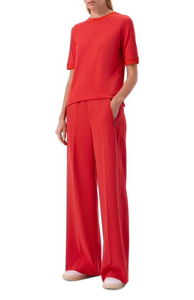 Прямые ярко-красные брюки с застроченными стрелками – комфортный вариант для прогулок в прохладную погоду. Для изготовления модели мастера марки использовали тонкий шерстяной трикотаж с добавлением нежного кашемира для дополнительной легкости, мягкости и тепла. За удобную посадку на талии отвечает широкий эластичный пояс.