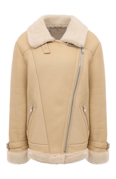 Крой бежевой дубленки роднит ее с косухой. О прототипе напоминает не только диагональная молния, но и паты на рукавах, а также широкий отложной воротник, который можно зафиксировать ремешком. Для изготовления модели использовали мягкую и при этом плотную овчину с густым коротким мехом на изнаночной стороне.