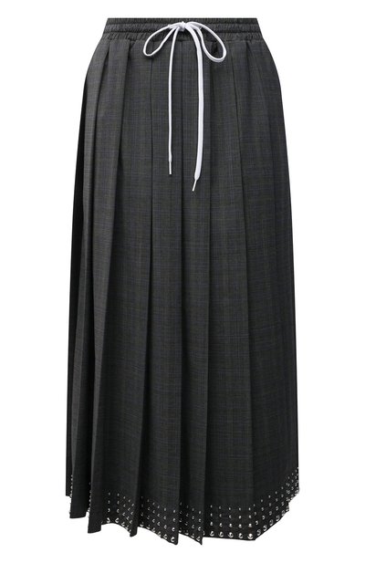 Несмотря на клетчатый узор и длину чуть ниже колена юбка из осенне-зимней коллекции не выглядит строго. Миучча Прада расставила акценты с помощью эластичного пояса-кулиски и серебристых шипов: она подчеркнули край изделия. Для пошива модели использовали мягкую тонкую шерсть, которая почти не мнется.