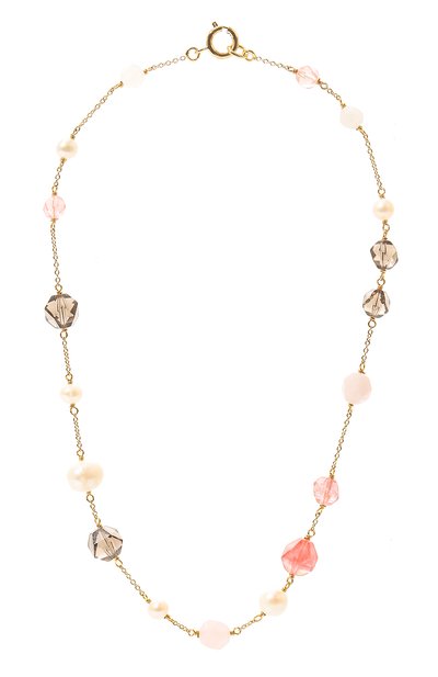 Для создания изящного колье в виде тонкой цепочки мастера бренда использовали прочный ювелирный сплав с гальваническим покрытием золотом 585 пробы. Внимание акцентировали бусинами из чередующегося розового и дымчатого кварца. Аксессуар дополнили перламутровыми жемчужинами, уникальная форма которых никогда не повторяется.