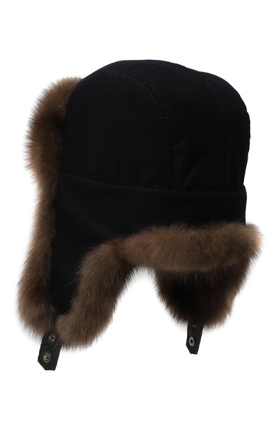 Темно-синяя шапка-ушанка получилась особенно теплой. Верх выполнили из легкого непродуваемого кашемира, а для отделки использовали густой пушистый мех соболя с характерными переливами. Дополнительный комфорт гарантируют широкие наушники, которые можно закрепить с помощью завязок с кнопкой под подбородком или на затылке.