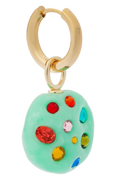 Крупная моносерьга оттенка мятных леденцов поможет освежить повседневный образ. Для изготовления основания в виде небольшого кольца использовали полированный металл с золотистым напылением. Подвеску из полимерной глины с глянцевым прозрачным покрытием инкрустировали сверкающими цветными кристаллами разной формы.