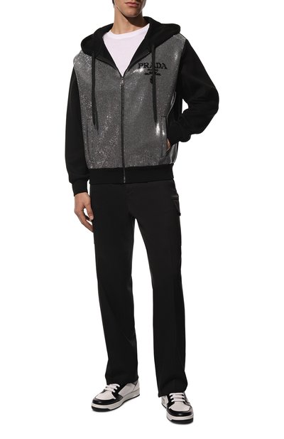 Толстовку украсили вдоль плечевой линии узором из заклепок и граненых переливающихся кристаллов. Модель с капюшоном и застежкой-молнией выполнили из плотного хлопкового трикотажа .