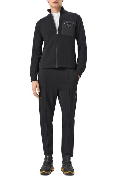 Черные брюки из коллекции сезона осень-зима, которая стала первой совместной мужской для Миуччи Прады и Рафа Симонса, выглядят сдержанно, но не нарочито строго. Вывести модель за пределы формального гардероба дизайнерам помогла укороченная длина, а в остальном они следовали канонам. Изделие выполнили по классическим лекалам из плотной костюмной шерсти в деликатную полоску.