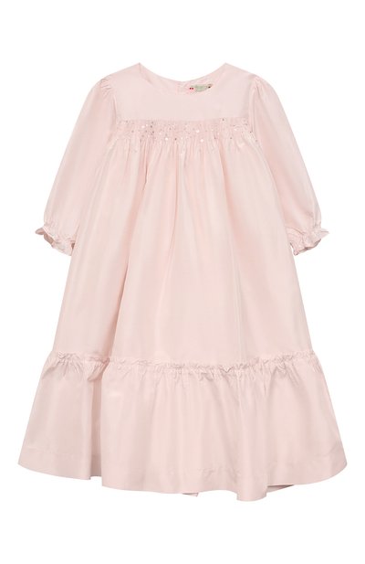 Мастера марки сшили свободное бледно-розовое платье из тонкой шелковой тафты с деликатным блеском. Ему вторит мерцание миниатюрных пайеток на вышивке, которой украсили лиф спереди. Праздничное настроение модели поддерживают объемные рукава 3/4, а также оборки на манжетах и подоле. Дополнительный комфорт обеспечивает подкладка из дышащей нежной вуали.