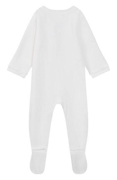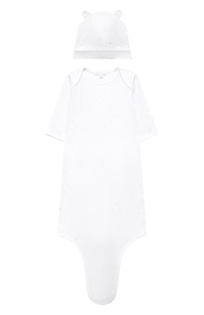 Конверт, который можно завязать снизу, сшили из мягкого перуанского хлопка пима с мотивом в виде узких серых полос и медведей. Этот легкий и особенно приятный на ощупь материал хорошо пропускает воздух, позволяя коже дышать. В комплект входит шапка с отворотом и небольшим ушами.