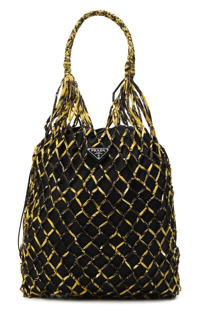 Сумка с двумя короткими ручками сплетена вручную в технике макраме из узких желтых шнуров. Внутри — съемный мешок из прочного матового нейлона, произведенного из переработанного океанического пластика и старых рыбацких сетей. Для отделки аксессуара Миучча Прада выбрала черную сафьяновую кожу.