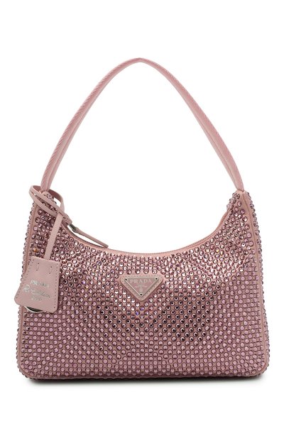 У сумки Re-Edition 2000 есть все шансы стать ключевым акцентом в образе. Пудрово-розовый оттенок стал идеальным фоном для россыпи сверкающих стразов, эффектно отражающих свет в движении. Для пошива изделия использовали знаковый переработанный нейлон, производство которого меньше вредит окружающей среде. В модель с короткой ручкой поместятся кошелек, смартфон, ключи и помада.