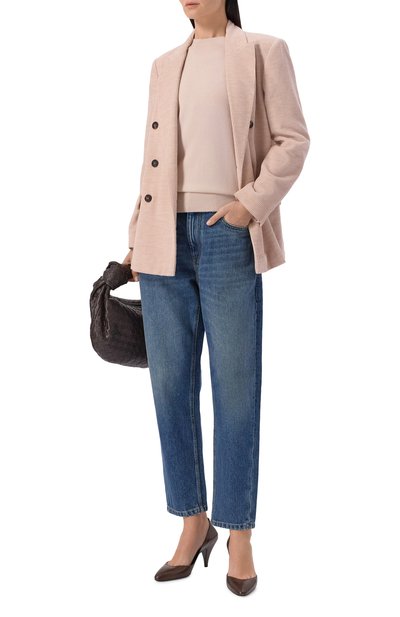 Голубой пуловер в исполнении Миуччи Прады получился в равной степени романтичным и комфортным. Для изготовления ажурной модели с объемными рукавами-фонарикам и глубоким квадратным вырезом, подчеркивающим ключицы, дизайнер выбрала нежный мохер, усиленный нитями нейлона. Изделие из такого легкого пушистого м атериала почти не ощущается на теле, но при этом поддерживает оптимальную для него температуру.