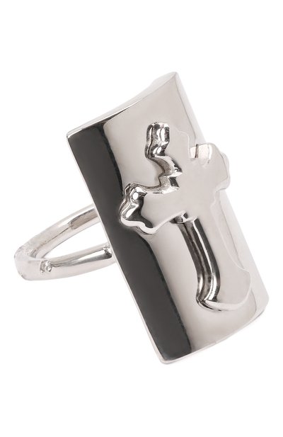 Евгения Левашова-Елагина часто украшает аксессуары изображениями фигурных крестов. Такую рельефную деталь дизайнер поместила и на напоминающую рыцарский щит вставку на этом узком кольце. С внутренней стороны модель из полированного серебристого металла декорировали надписью в готическом стиле.