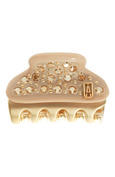 Небольшую бежевую заколку изготовили из легкого прочного ацетата, отполированного до глянцевого блеска. Аксессуар декорировали россыпью кристаллов Swarovski, закрепленными вручную. Закругленные зубцы и фирменный пружинный зажим плотно удерживают локоны, не травмируя кожу головы и структуру волос.