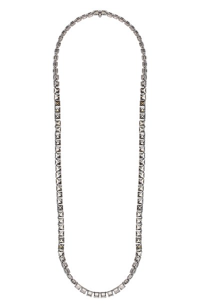 Колье можно сочетать с другими украшениями или носить самостоятельно двумя способами — развернув на всю длину или дважды обернув вокруг шеи. Аксессуар из ювелирного сплава с черным родиевым покрытием инкрустировали квадратными кристаллами. Их четкие линии и дымчатый оттенок креативный директор Джованна Батталья-Энгельберт позаимствовала у графичных картин Густава Климта.