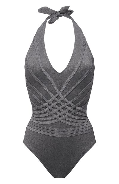 Серебристый слитный купальник визуально формирует отчетливый силуэт «песочные часы» благодаря узору из переплетенных лент. Мастера марки нашили их на мягкий эластичный материал, который плотно, но комфортно облегает фигуру и быстро сохнет. Завязки на шее помогут отрегулировать посадку.
