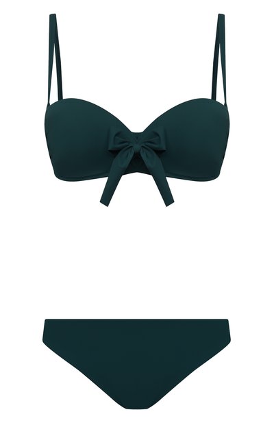 В раздельном купальнике сделали ставку на изумрудный оттенок. Он надолго сохранит сочность, потому что прочный эластичный полиамид не боится солнца, хлора и соли. Посадка бра регулируется завязками, продетыми в люверсы под вырезом, а, отстегнув бретели, его можно превратить в бандо.