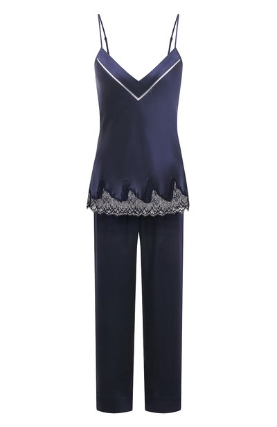 Пижаму Nocturne сшили из шелкового атласа, который е два ощущается на теле. Топ с регулируемыми бретелями украсили фестончатым кружевом снизу и вставкой из тюля, подчеркивающей V-образный вырез. Свободные брюки с узким поясом оставили без декора.