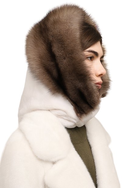 Косынку оттенка горького шоколада мастера марки сшили вручную из шелковистого меха норки. Шкурки бережно выделали, сохранив естественные свойства пушнины, а затем постригли и выщипали жесткий остевой волос, поэтому поверхность материала стала похожа на нежный велюр. Оторочку по основанию выполнили из пушистого меха с легким блеском.
