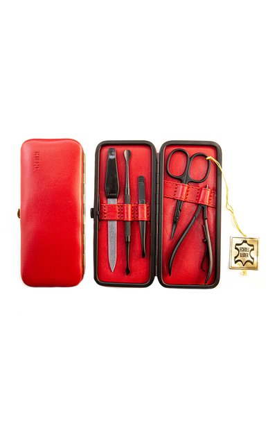 На фоне яркого красного чехла эффектно смотрятся контрастные маникюрные инструменты. Черный цвет им придает гладкий слой тефлона, который отталкивает влагу и грязь, тормозит размножение бактерий. Еще одно достоинство такого покрытия — инертность: материал не реагирует ни с чем в организме, поэтому обработанные с его помощью изделия можно использовать при аллергии на металл.