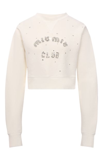 Спокойный кремовый оттенок укороченного свитшота из коллекции сезона весна-лето стал идеальным фоном для крупного логотипа бренда, выложенного сверкающими кристаллами. Мастера марки сшили модель из мягкого легкого хлопка, который сохраняет оптимальную для тела температуру и почти не ощущается на коже.
