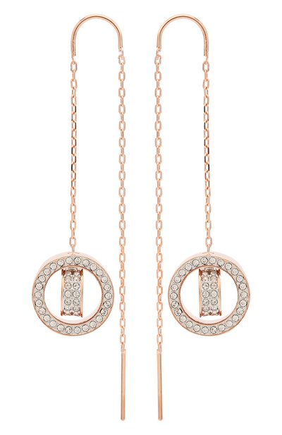 Длинные серьги, откликающиеся на малейшее движение, будут уместно смотреться и в casual-образе, и в коктейльном наряде. Тонкие цепочки, ниспадающие с двух сторон мочки, декорировали на концах лаконичным цилиндром и вставленными друг в друга широкими кольцами со сверкающим паве. Для изготовления модели использовали полированный металл с покрытием цвета розового золота.