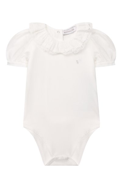 Дизайнеры марки умеют находить баланс между комфортом и красотой, и это белое боди – яркое доказательство. Мягкое хлопковое джерси позволяет коже дышать и не раздражает ее, а сверкающая литера M и драпированный воротник с кружевным кантом создают правильные акценты. В деликатные складки собраны и короткие рукава из тонкой гладкой ткани. Модель застегивается едва заметными кнопками сзади и снизу.