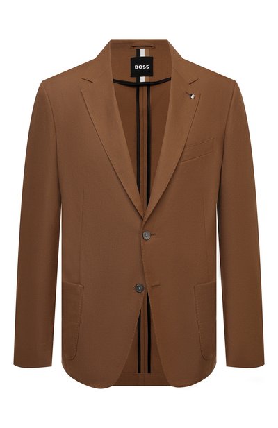 Обычно формальную одежду шьют из тонкой шерсти, но для создания этого коричневого пиджака с прямоугольными лацканами использовали мягкую хлопковую ткань с фактурным узором, напоминающим плетение. Этот материал хорошо пропускает воздух и слегка тянется, не сковывая движения, но не деформируется со временем. За счет отсутствия подкладки изделие идеально садится по фигуре. Петлицу декорировали эмалевой деталью с полосами в фирменных цветах.