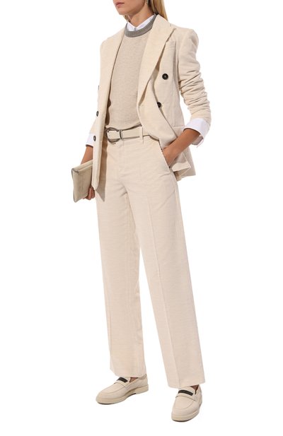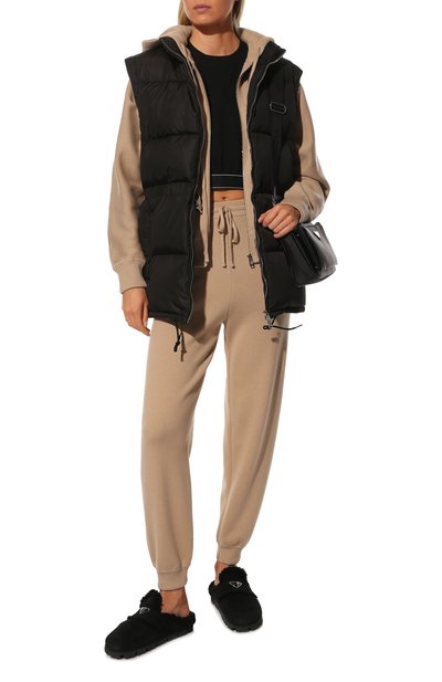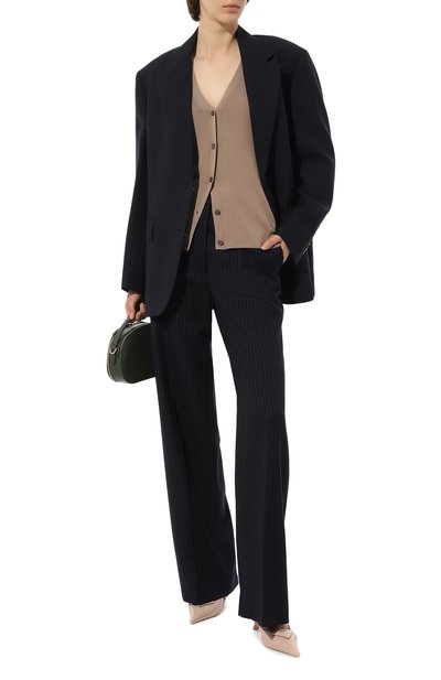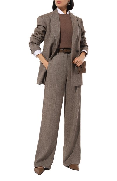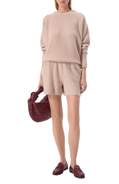 В формулу комфорта темно-бежевого пуловера Миучча Прада и Раф Симонс включили три пункта: свободный силуэт, спущенная линия плеч и приятный на ощупь материал. Для изготовления модели из весенне-летней коллекции дизайнеры выбрали нежную кашемировую пряжу. Небольшим отступлением от привычного исполнения стал вырез лодочка со шнуровкой на плечах.