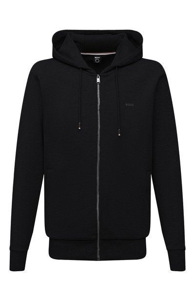 Аскетичная толстовка с миниатюрным логотипом марки, основанной Хуго Фердинандом Боссом, выполнена по всем канонам стиля athleisure. Крой, как у спортивной одежды, отвечает за свободу движений, а уютный футер из органического хлопка – за leisure. Сырье для такого материала собирают вручную, очищая от жестких частиц, поэтому черная модель из весенне-летней коллекции получилась очень мягкой.