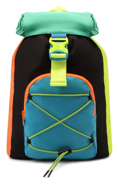 Яркий рюкзак выполнили в технике color block из мягкого прочного текстиля. Материал, произведенный из переработанных волокон, обработали водоотталкивающим составом, поэтому вещи внутри останутся сухими после небольшого дождя. Во внешнем кармане удобно хранить ключи.