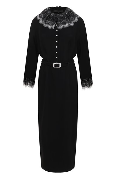 Платье в исполнении Светланы Тегин — готовый наряд для вечера в театре. Осталось встать на каблуки и взять в руки небольшую сумку. Особенно женственной модель из мягкого тонкого шелка делает прямой подол и приталенный силуэт, подчеркнутый узким ремешком. Драматизм черного цвета усиливают широкий воротник и манжеты, выполненные из черно-белого нежного кружева с цветочным мотивом и бахромой по краю фестонов. Изделие из коллекции сезона весна-лето застегивается пуговицами спереди.