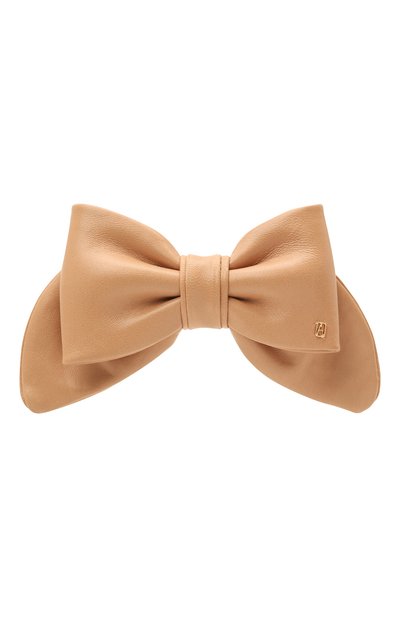 Эту заколку украсили крупным объемным бантом оттенка сливочной карамели. Декор вручную изготовили из гладкой мягкой кожи с маслянистым блеском, подчеркнув принадлежность изделия марке миниатюрной золотистой эмблемой. Аксессуар фиксируется на волосах при помощи автоматического зажима из легкого прочного металла.