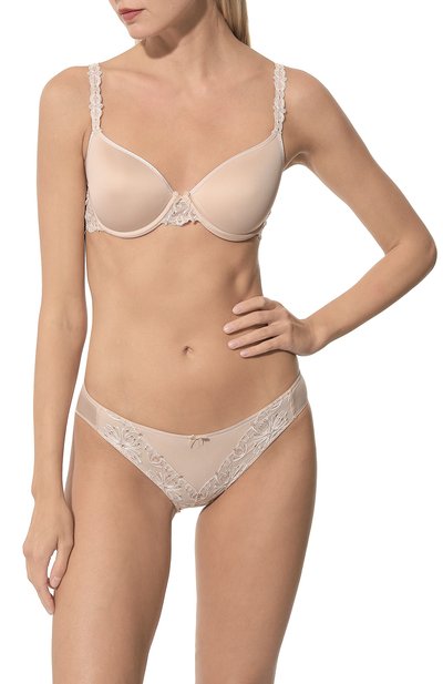 Для пошива бюстгальтера с плотными чашечками на косточках дизайнеры бренд а выбрали шелковистый гладкий текстиль, сотканный из волокон переработанного полиэстера. Фактурности аксессуару добавили кант и широкий пояс из тюля с цветочной вышивкой. Таким же материалом декорировали регулируемые бретели, не впивающиеся в тело.