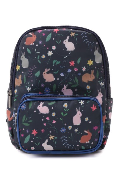 Для изготовления темно-синего рюкзака с ярким принтом в виде кроликов и цветов использовали прочный текстиль из переработанного полиэстера. Изделие из такого материала не промокает и легко очищается от загрязнений, поэтому за ним несложно ухаживать. В аксессуар с усиленными швами поместятся альбом, пенал и сменная пара обуви.