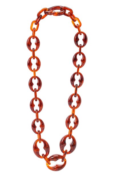 Массивное, но при этом легкое коричневое колье-цепь с крупными фигурными звеньями выполнено из комбинации гипоаллергенного металла и глянцевого плексигласа, напоминающего янтарь. Украшение с застежкой-карабином поможет правильно расставить акценты в любом образе.