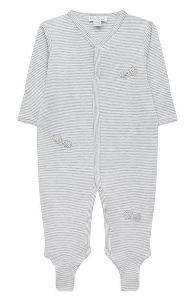 Для пошива серого полосатого комбинезона мастера марки использовали тонкое нежное джерси из длинноволокнистого хлопка пима, который в мягкости не уступает кашемиру. Изделие из такого материала не раздражает кожу, хорошо пропускает воздух и быстро отводит влагу, а за счет кнопок спереди и вдоль шаговых швов его удобно надевать и снимать. Модель декорировали вышивкой в виде ежей.