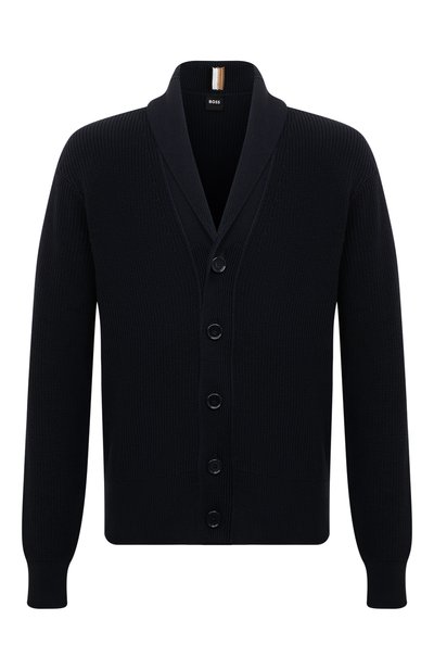 Мастера марки, основанной Хуго Фердинандом Боссом, выполнили этот кардиган из нежного хлопка, поэтому он пропускает воздух лучше шерстяных моделей. Волокна кашемира в составе пряжи придали вещи особую мягкость, а вязка английской резинкой сделала ее эластичной. Темно-синее изделие с шалевым воротником вошло в весенне-летнюю коллекцию.