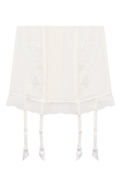 Изысканное кружево и утонченная вышивка на полупрозрачном тюле возводят корсетный пояс оттенка экрю в ранг настоящего произведения швейного искусства. Благодаря безупречному исполнению, ребрам жесткости и эластичным нитям в составе тончайшего материала белье идеально садится, плотно облегая фигуру и слегка корректируя силуэт. Чувственная модель с шестью атласными пажами для чулок и узкой расклешенной оборкой застегивается крючками сзади.