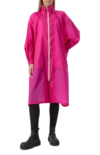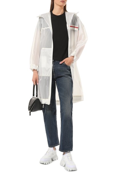 Для изготовления плаща насыщенного голубого оттенка Миучча Прада и Раф Симонс выбрали прочный шелковистый нейлон Re-Nylon. Такой легкий и тонкий материал произвели из переработанного пластика и остатков рыболовных сетей, выловленных в океане. Модель свободного кроя дополнили широкими отлетными кокетками и поясом-кулиской, которым можно регулировать посадку на талии.