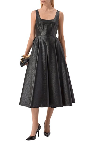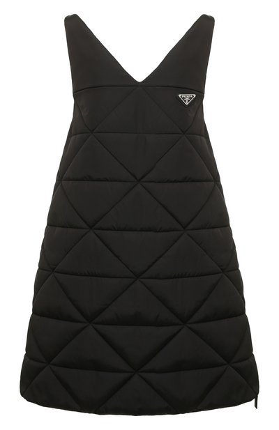 В дизайне мини-платья все гармонично: и чистый черный цвет, и отсутствие ярких акцентов, и перекликающиеся между собой V-образный вырез, трапециевидный силуэт и треугольный стеганый мотив. Для пошива модели Миучча Прада и Раф Симонс выбрали легкий нейлон Re-Nylon, произведенный из регенерированного сырья. Такая технология снижает негативное воздействие на окружающую среду.