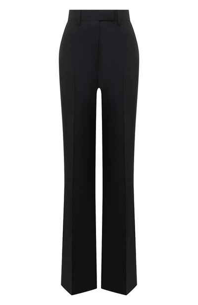 Очищенные от декора темно-синие брюки с высокой посадкой будут выглядеть безупречно в любой обстановке и станут универсальным солдатом в гардеробе. Для пошива расклешенной модели Миучча Прада и Раф Симонс выбрали особенно тонкую мягкую шерсть с шелковистым блеском. Стрелки добавляют изделию графичности.
