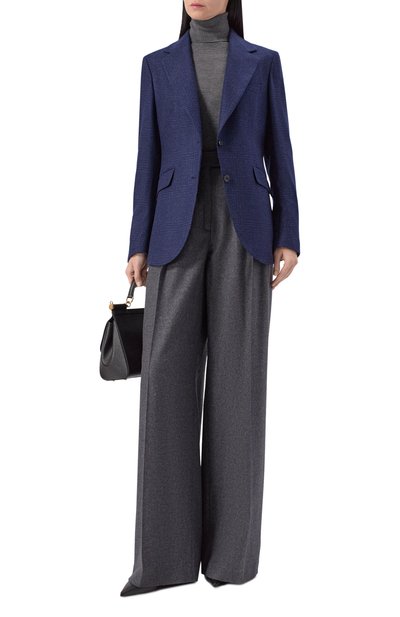 Темно-синий однобортный пиджак из тонкой, но плотной шерсти будто позаимствовали в мужском гардеробе. За сходство отвечают акцентированная линия плеч, прямой крой и широкие лацканы. На принадлежность изделия марке указывает знаковый треугольный патч сзади. На показе Миучча Прада и Раф Симонс сочетали модель с юбкой и топом, а наши стилисты предлагают создать образ с пуловером и брюками.