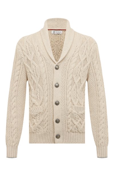 Дизайнеры бренда, основанного Брунелло Кучинелли, украсили кардиган спокойного бежевого оттенка крупным арановым узором. Мотив получился визуально объемным благодаря трубчатой структуре особенно тонкого и легкого хлопка Feather. Модель с шалевым воротником дополнили крупными накладными карманами спереди.