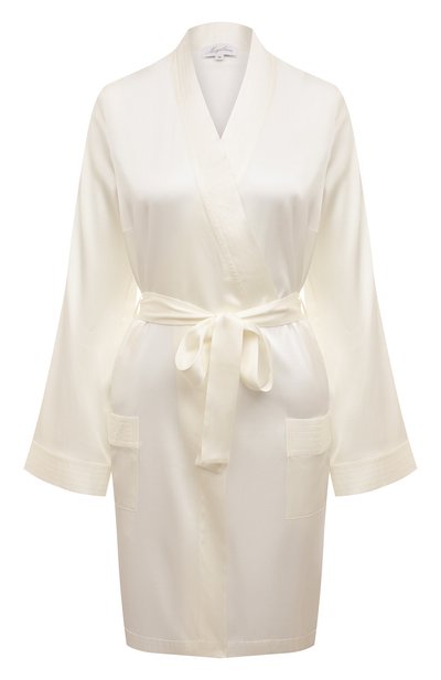Халат оттенка ванильного мороженого станет идеальным вариантом ко мфортной домашней одежды. Справиться с этой задачей ему поможет как не сковывающий движения крой, так и материал. Для пошива модели с поясом-лентой использовали нежный шелковый сатин с небольшим добавлением эластичных волокон.
