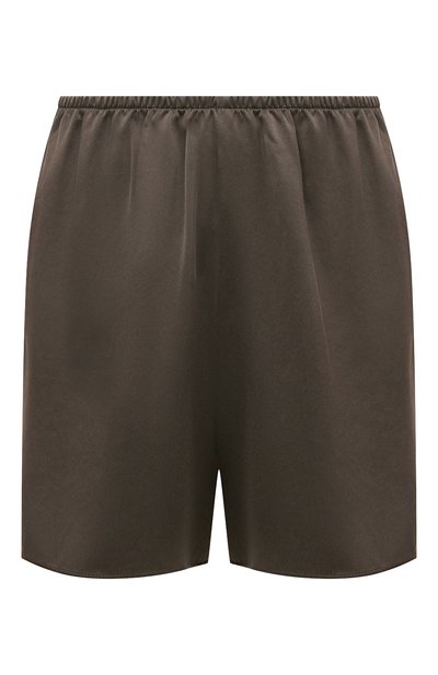 Оливковые однотонные шорты с узким эластичным поясом, плоскими незаметными швами и разрезами по бокам выполнены из гладкого мягкого шелка. Струящаяся тонкая ткань приятно охлаждает кожу в жаркие дни и сохраняет тепло в прохладные, а продуманный крой не мешает свободно двигаться.
