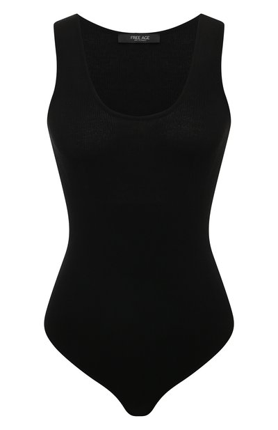 Черное боди, стилизованное под майку с круглым вырезом и глубокими проймами, получилось особенно комфортным благодаря материалу. Для изготовления однотонной модели без декора мастера марки использовали тонкий фактурный трикотаж на основе нежного шелка. Чтобы изделие не растягивалось и плотнее облегало фигуру, в пряжу добавили вискозные волокна.