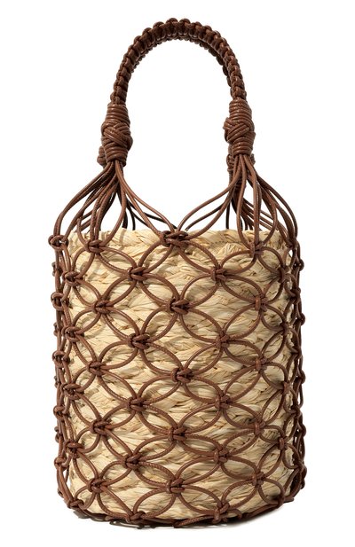 Коричневая миниатюрная сумка с двумя короткими ручками, обвитыми узкими шнурами из гладкой кожи, напоминает цилиндрическую корзину. Миучча Прада передала это сходство плетеными лентами из гибкой соло мки и крупной сеткой-чехлом, которую связали в технике макраме. В аксессуар со съемным плечевым ремнем поместятся кошелек, смартфон, ключи и флакон любимого аромата.