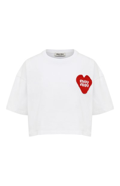 Чистый белый цвет этой укороченной футболки стал идеальным фоном для крупной контрастной аппликации. Мастера марки связали ее вручную, придав форму алого сердца, а логотип бренда выделили с помощью комбинации оттенков. Для пошива модели Миучча Прада выбрала мягкий тонкий хлопок джерси.