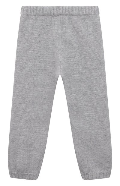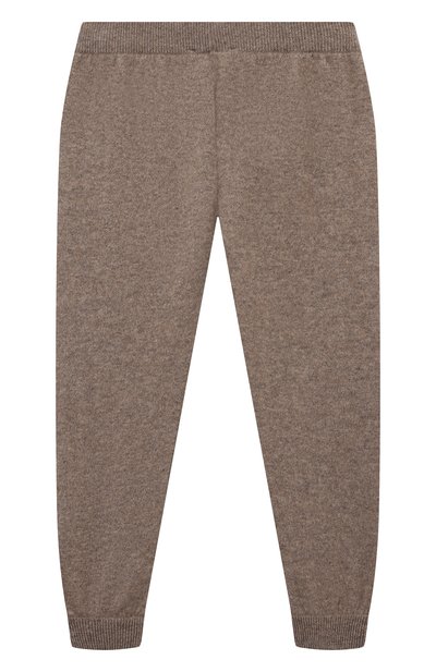 Брюки с закрученными в ролик манжетами выполнили из чистого кашемира. Пояс и широкий кант по краю накладных боковых карманов связали в технике резинки.