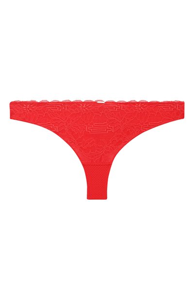 Кораллово-красные стринги с низкой посадкой и фестончатыми краями настолько мягкие и легкие, что почти не ощущаются на теле. Эластичные однотонные трусы, украшенные миниатюрной пластиной с логотипом марки, сшиты из тонкого ливерсного кружева с нежным цветочным мотивом.