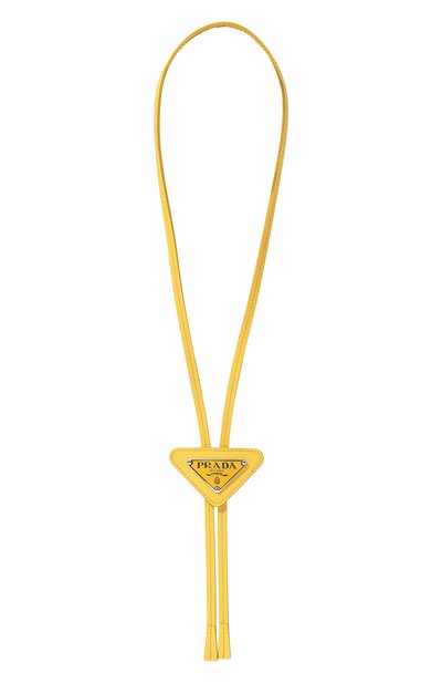 Галстук боло насыщенного желтого цвета мастера марки выполнили из плотной сафьяновой кожи с характерным рельефным тиснением. Роль слайдера и в то же время дек оративной детали выполняет узнаваемый треугольный элемент с логотипом бренда.